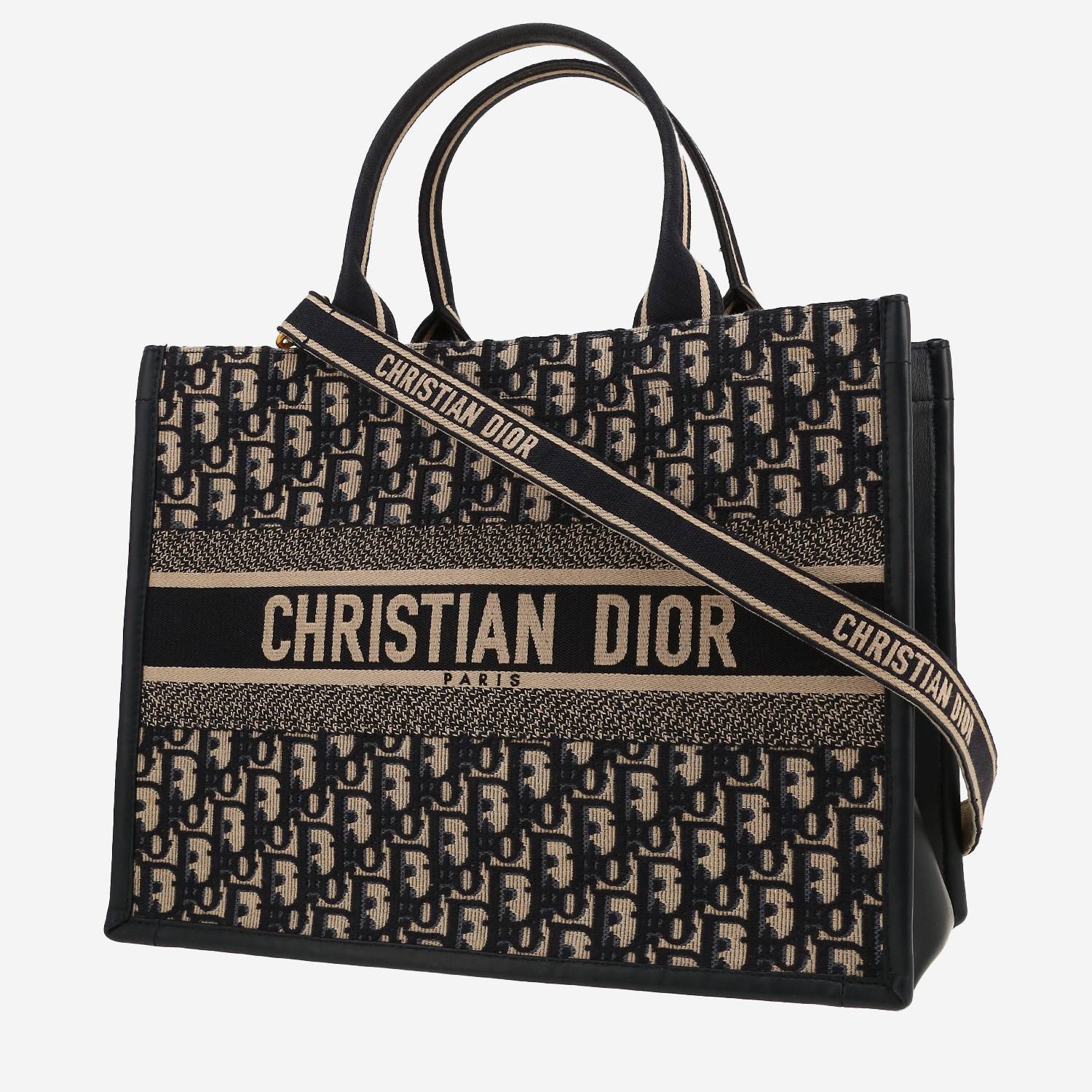 Elegante shopping bag Dior Book Tote modello medio in tessuto a monogramma Oblique blu e beige e pelle blu, doppio manico in tela blu a righe, una tracolla removibile in tela siglata blu da portare a mano o in spalla.