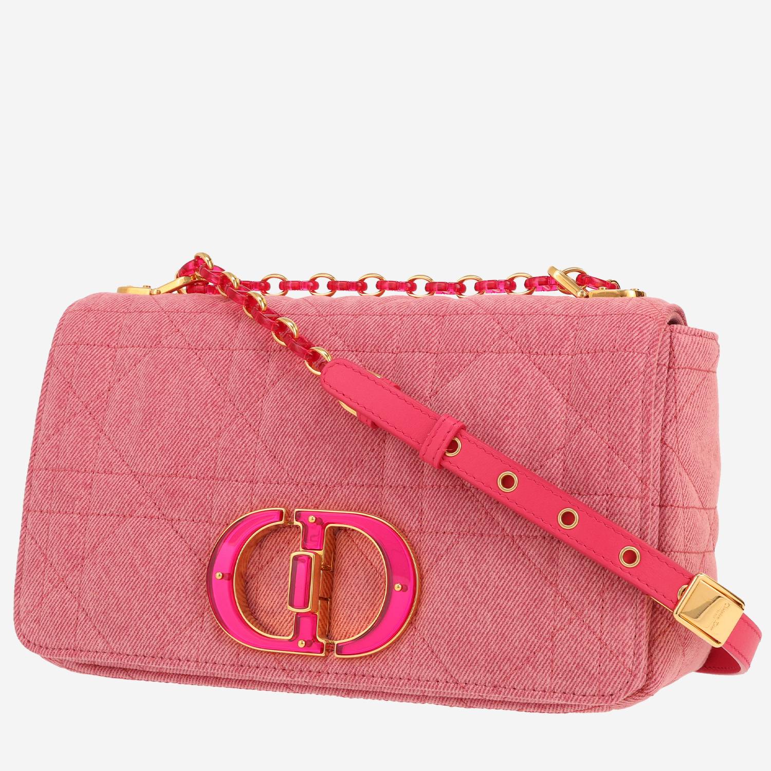 Magnifica borsa Dior Caro in tela denim rosa cannage, inserti in metallo dorato, una tracolla a catena trasformabile da portare in spalla o a tracolla.