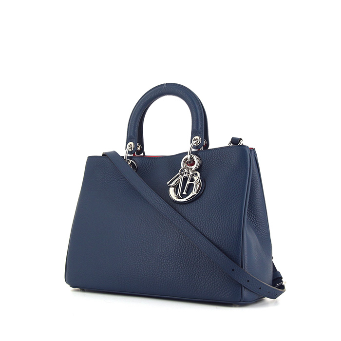 Intramontabile borsa a tracolla Dior Diorissimo in pelle martellata blu marino, inserti in metallo argentato, doppio manico in pelle blu marino, una tracolla rimovibile regolabile in pelle blu da portare a mano in spalla o a tracolla.