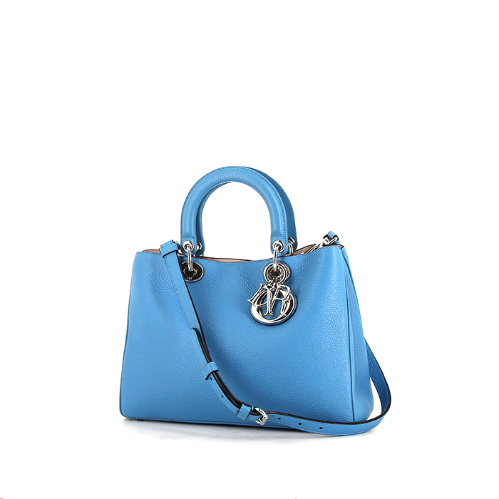 Magnifica borsa Dior Diorissimo modello medio in pelle martellata turchese, inserti in metallo argentato, doppio manico in pelle turchese, una tracolla rimovibile regolabile in pelle turchese da portare a mano o in spalla.