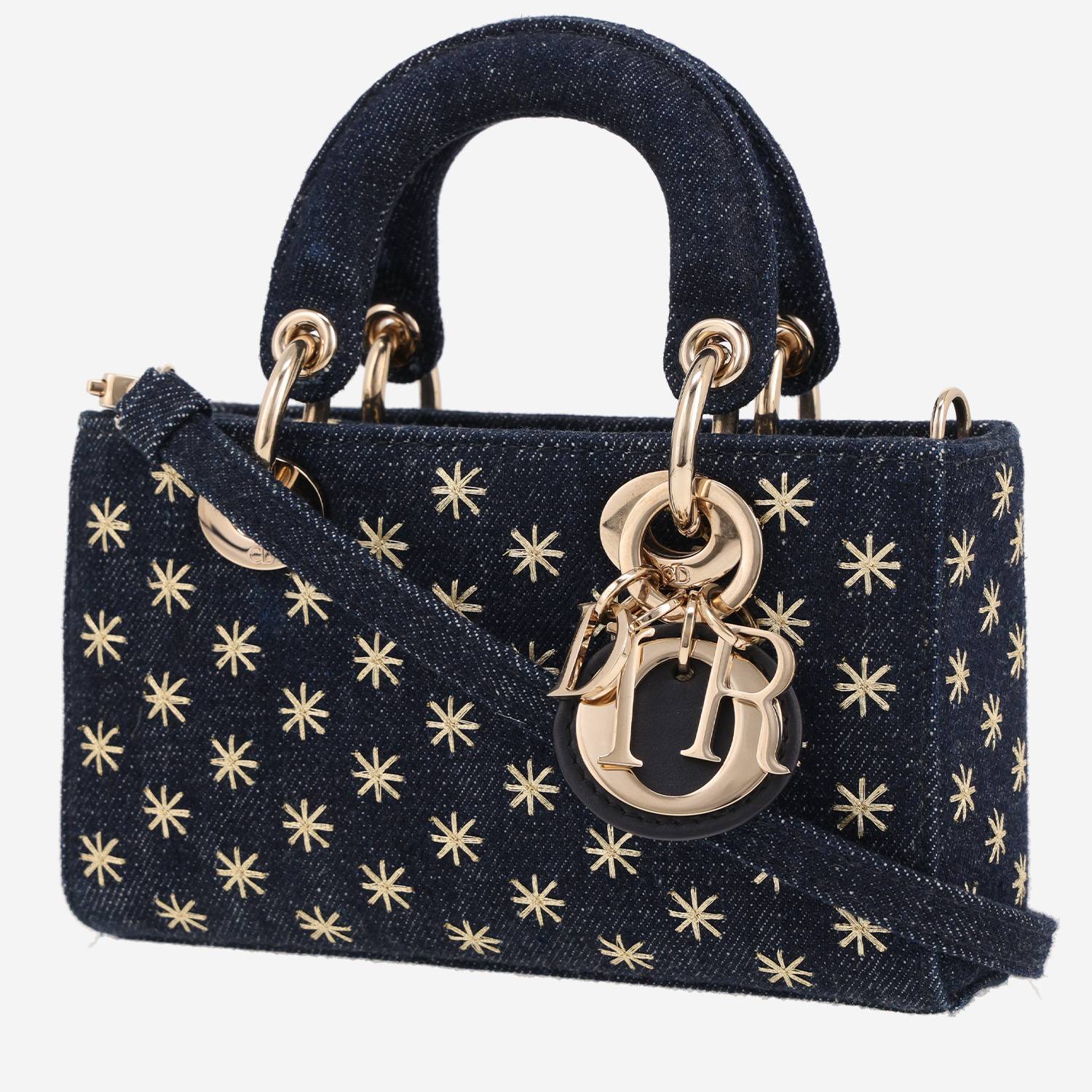 Magnifica borsa a tracolla Dior Lady D-Joy micro in denim blu ricamate, inserti in metallo dorato, doppio manico in denim blu, una tracolla a catena removibile in metallo dorato, tracolla removibile in denim blu da portare a mano, in spalla o a tracolla.