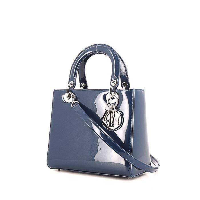 Elegante borsa a tracolla Dior Lady Dior modello medio in pelle verniciata blu, inserti in metallo argentato, doppio manico in pelle verniciata blu, tracolla rimovibile regolabile in pelle verniciata blu da portare a mano o in spalla.