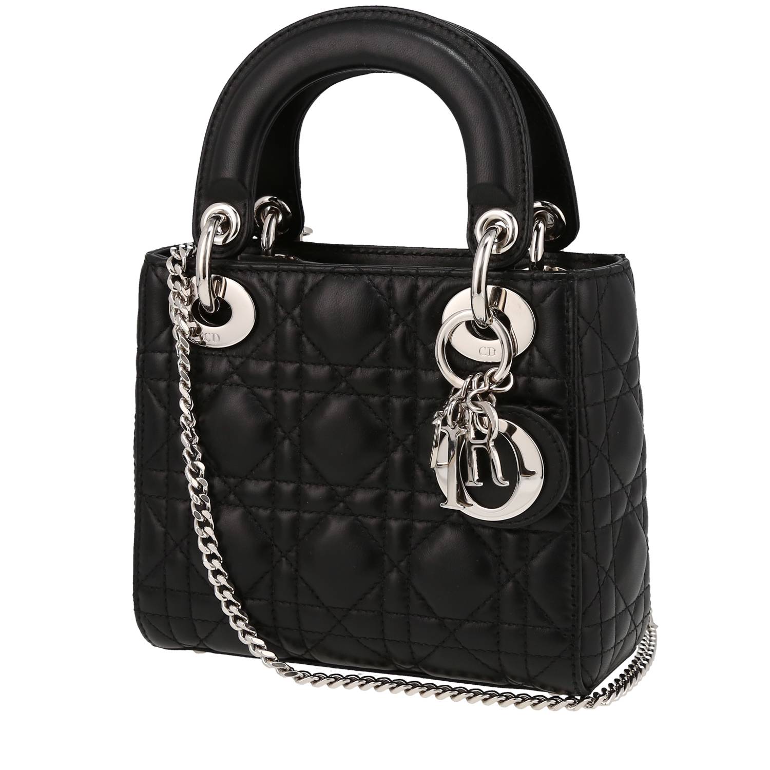 Magnifica borsa a tracolla Dior Mini Lady Dior in pelle cannage nero, inserti in metallo argentato, doppio manico in pelle nera, una tracolla a catena removibile in metallo argentato da portare a mano, in spalla o a tracolla.