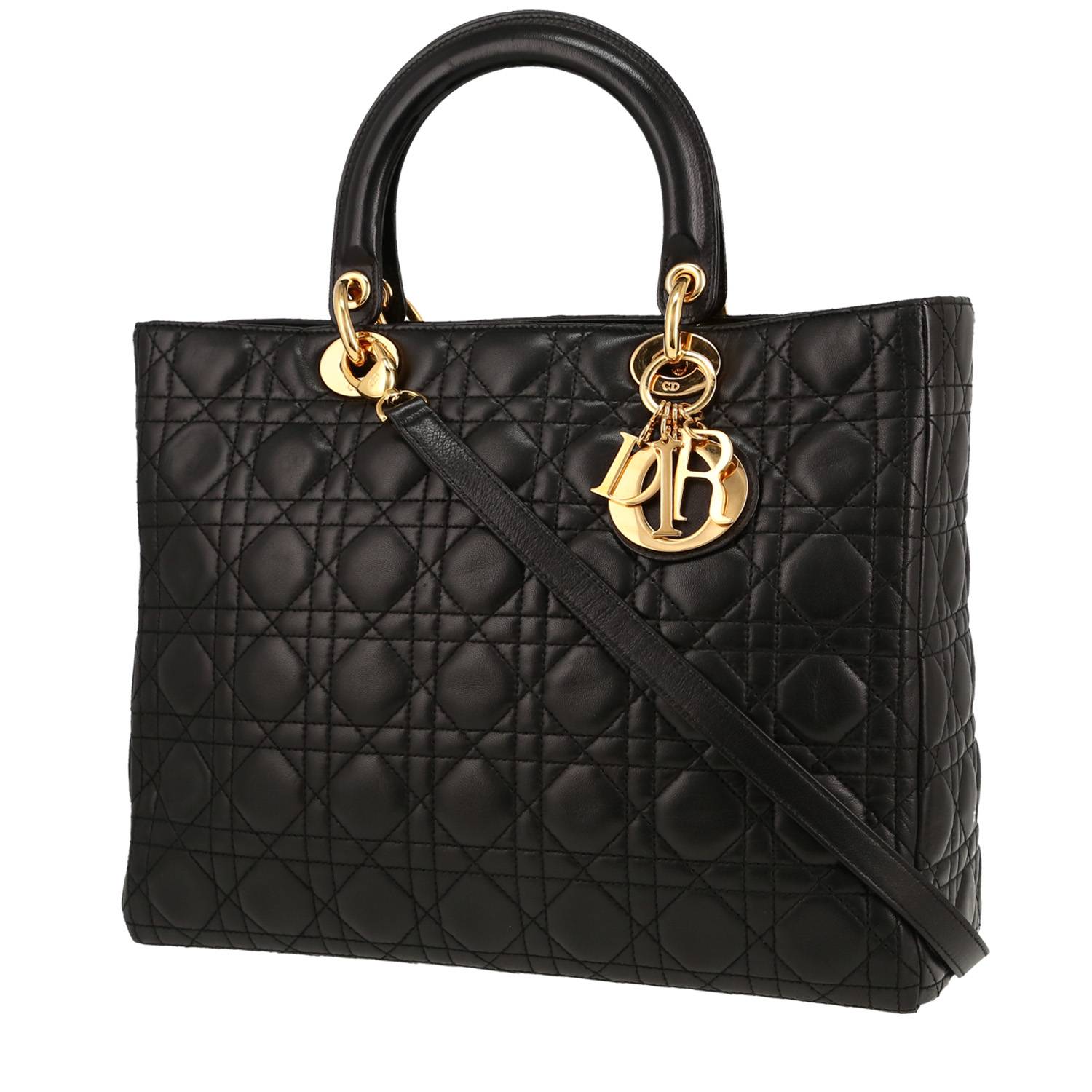 Inimitabile borsa Dior Lady Dior in pelle cannage nero, inserti in metallo dorato, doppio manico in pelle nera, tracolla removibile in pelle nera da portare a mano o in spalla.