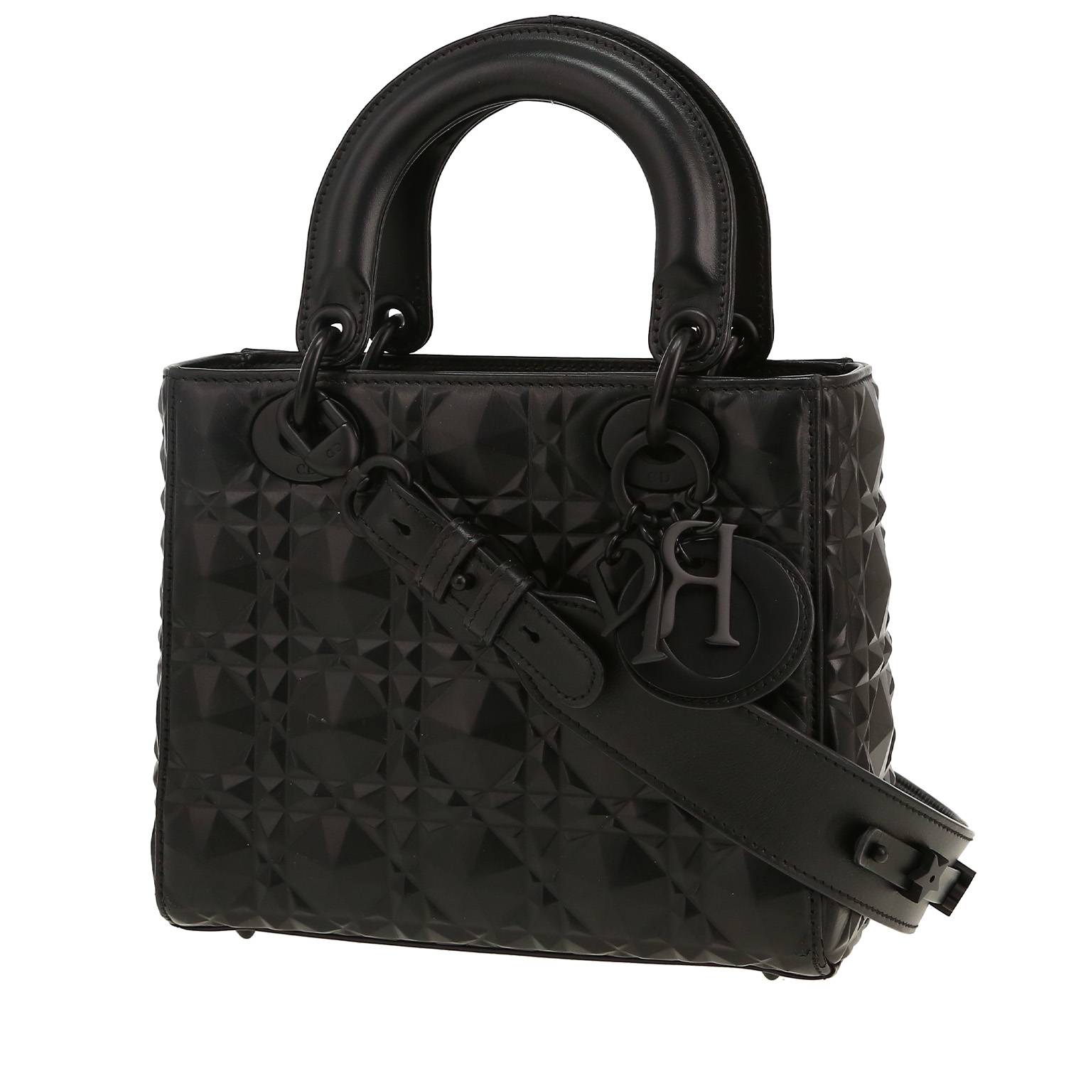Straordinaria borsa Dior Lady Dior in pelle cannage nero, inserti in metallo invecchiato, doppio manico in pelle nera, tracolla removibile in pelle nera da portare a mano, in spalla o a tracolla.