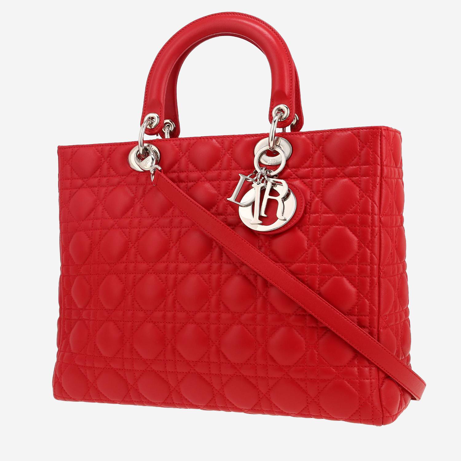 Inimitabile borsa Dior Lady Dior in pelle cannage rosso, inserti in metallo argentato, doppio manico in pelle rossa, tracolla removibile in pelle rossa da portare a mano o in spalla.