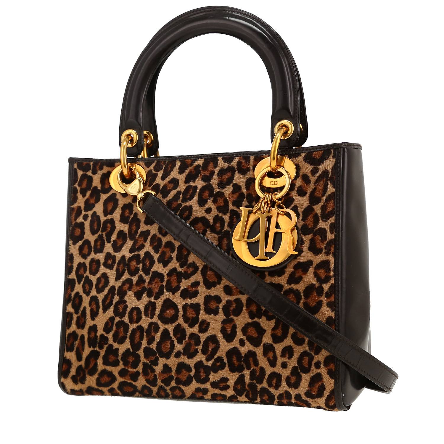 Magnifica borsa Dior Lady Dior in puledro marrone con stampa leopardata e pelle lucida marrone, inserti in metallo dorato, doppio manico in pelle lucida marrone, tracolla removibile in pelle lucida marrone da portare a mano o in spalla.