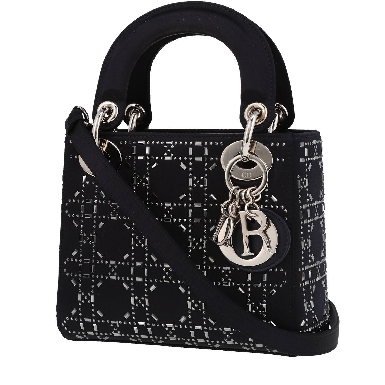 Splendida borsa Dior Lady Dior in raso blu marino con perle ricamate, inserti in metallo argentato, doppio manico in raso blu marino, tracolla rimovibile regolabile in raso blu marino da portare a mano, in spalla o a tracolla.