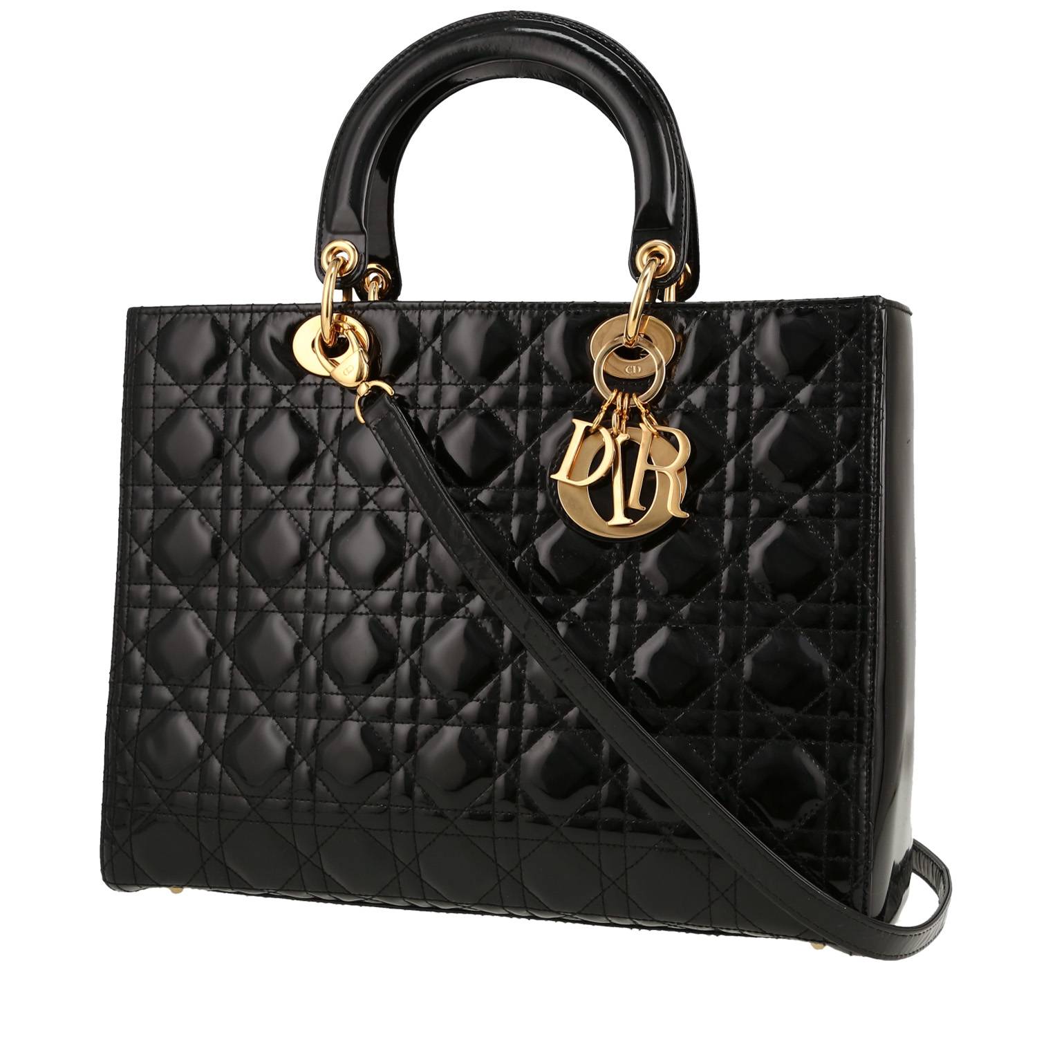 Inimitabile borsa Dior Lady Dior modello grande in pelle verniciata nero, inserti in metallo dorato, doppio manico in pelle verniciata nera, tracolla removibile in pelle verniciata nera da portare a mano, in spalla o a tracolla.