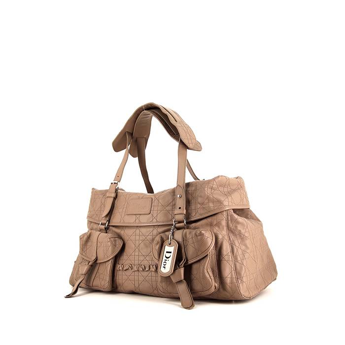 Incantevole borsa Dior Rasta in pelle cannage beige, inserti in metallo argentato, impunture beige, una doppia tracolla in pelle beige da portare a mano o in spalla.
