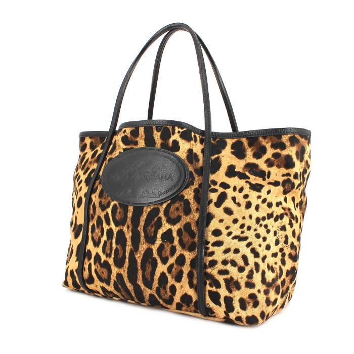 Graziosa shopping bag in tela con stampa leopardata e pelle nera, doppia tracolla in pelle nera, da portare a mano o in spalla.