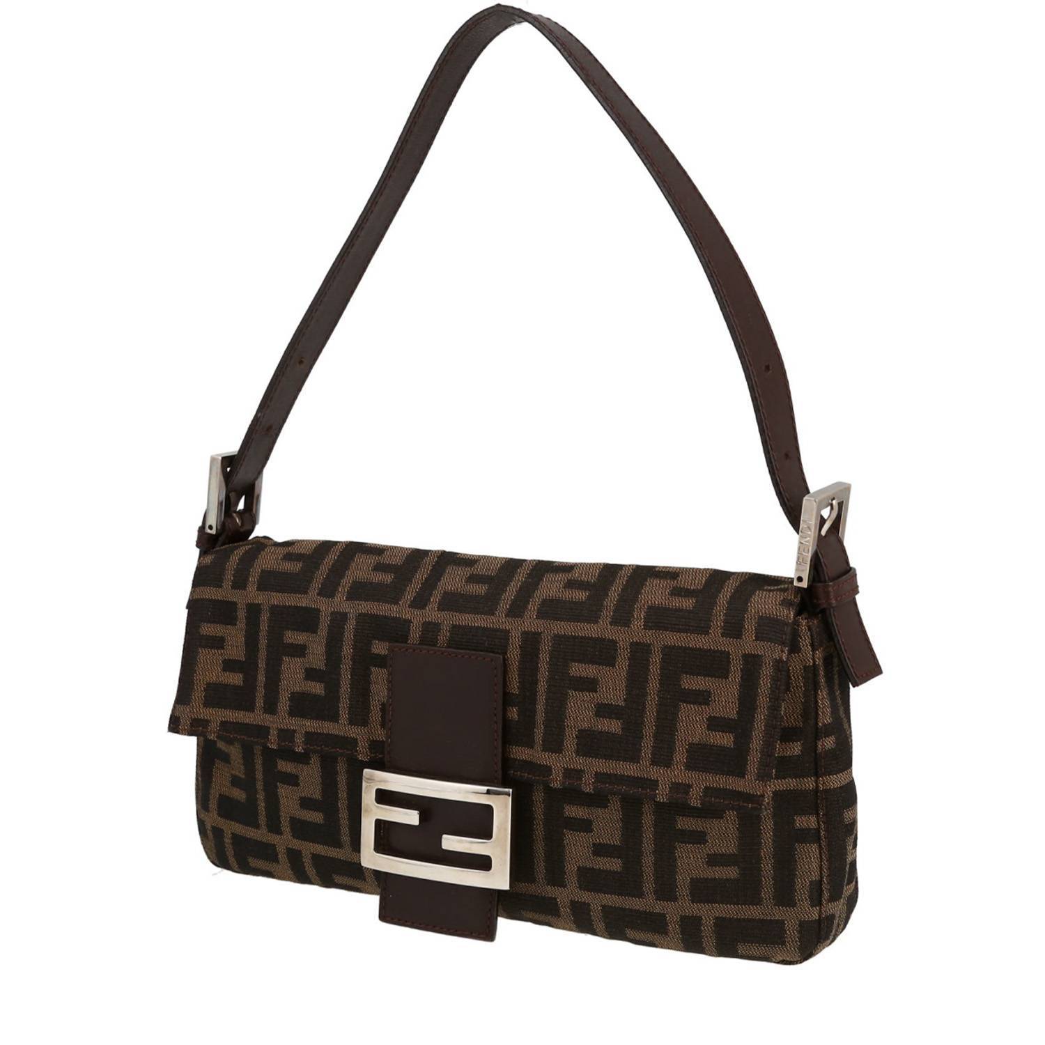Splendida borsa Fendi Baguette in tela siglata marrone e pelle marrone, inserti in metallo argentato, una tracolla regolabile in pelle marrone da portare a mano o in spalla.
