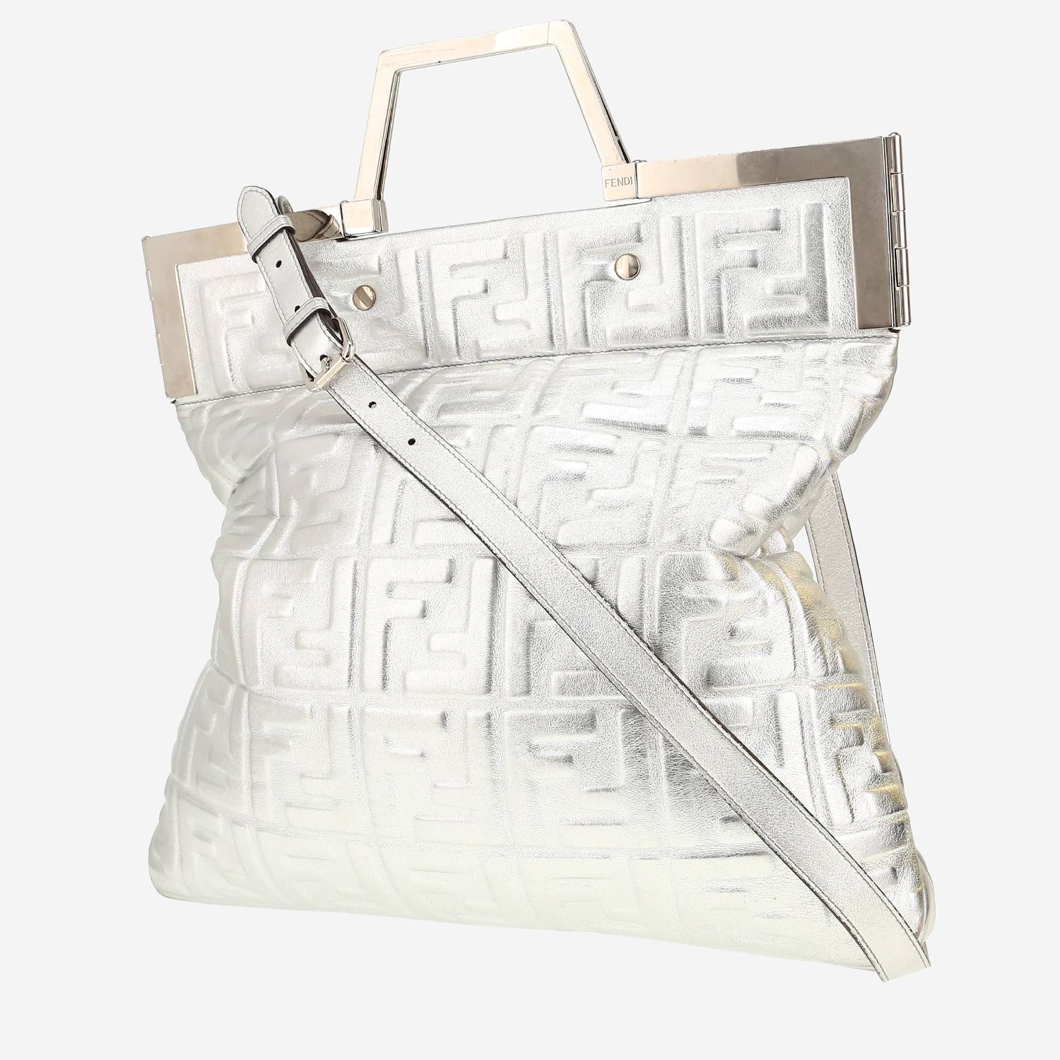 Divertente borsa Fendi in pelle monogram argentato, inserti in metallo argentato, doppio manico in metallo argentato, tracolla in pelle argentata da portare a mano, in spalla o a tracolla.