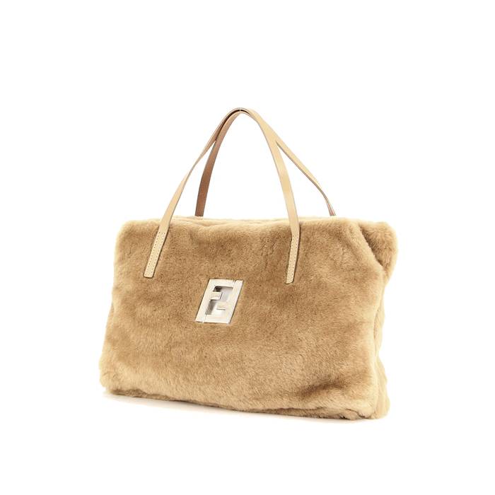 Bella borsa in simil-pelliccia beige, doppio manico in pelle beige da portare a mano.
