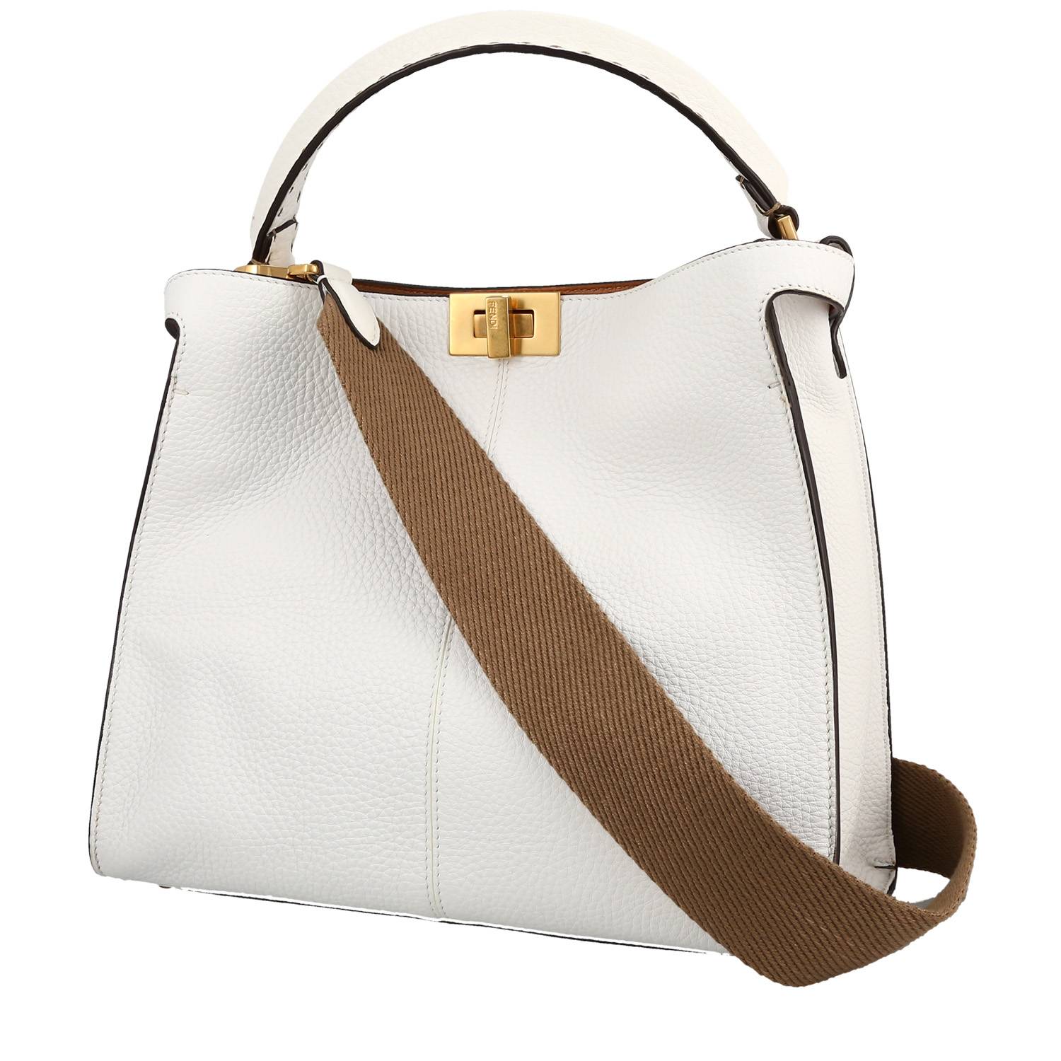 Bella borsa Fendi Peekaboo in pelle martellata bianco, inserti in metallo dorato, manico semplice in pelle bianca, tracolla removibile in tessuto marrone da portare a mano, in spalla o a tracolla.