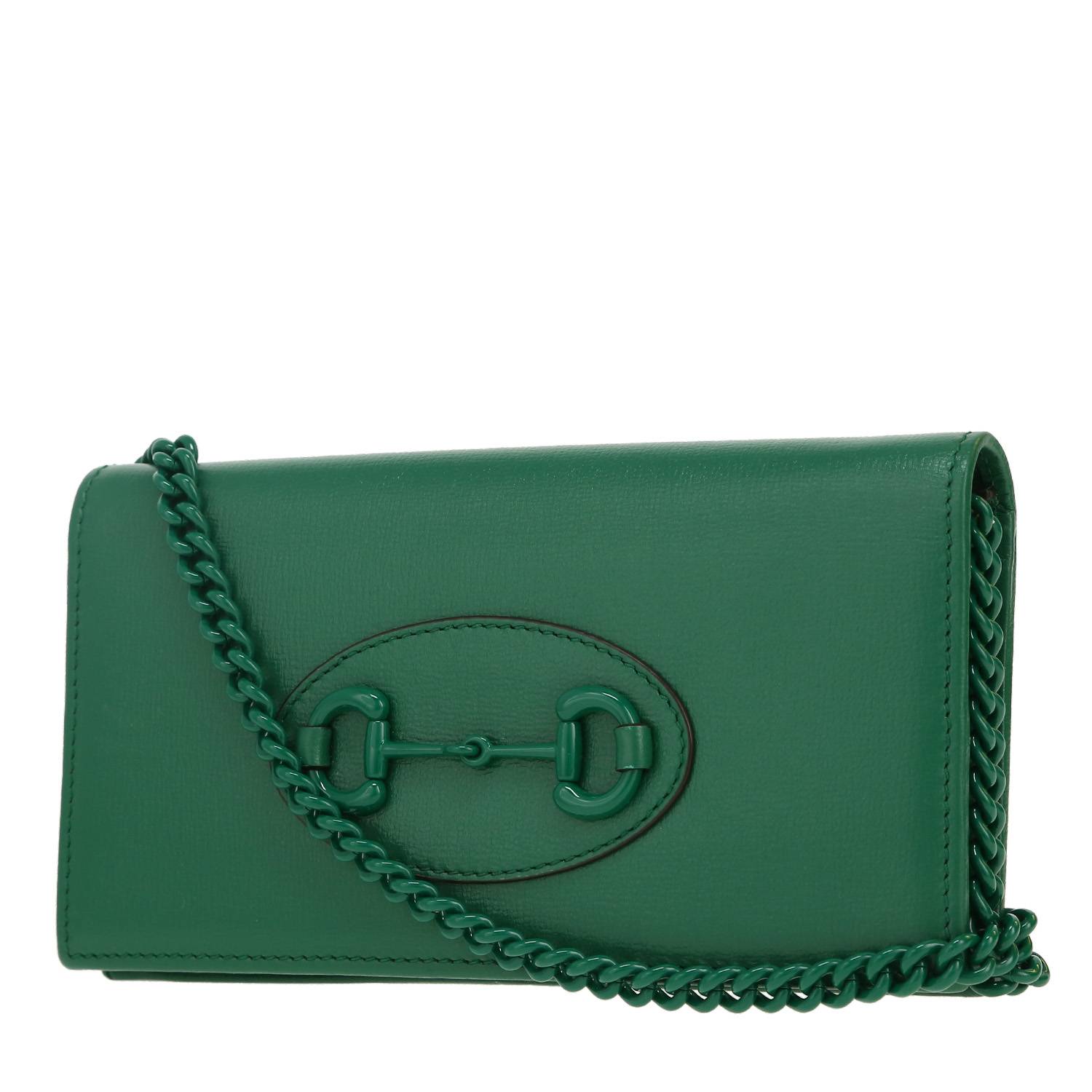 Incantevole borsa a tracolla Gucci 1955 Horsebit in pelle verde, inserti in metallo dorato, tracolla a catena in metallo verde da portare a mano, in spalla o a tracolla.