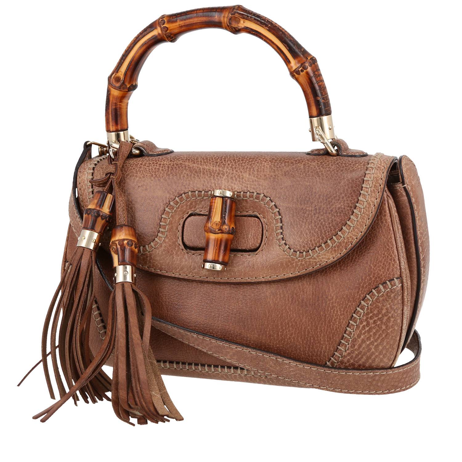 Divertente borsa a tracolla Gucci Bamboo in pelle marrone e bambù, inserti in metallo dorato, manico semplice in bambù, tracolla removibile in pelle marrone da portare a mano, in spalla o a tracolla.