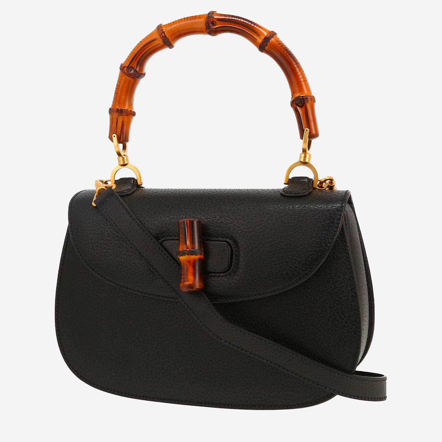 Magnifica borsa Gucci Bamboo in pelle martellata nero e bambù, inserti in metallo dorato, doppio manico in bambù, una tracolla rimovibile regolabile in pelle nera da portare a mano, in spalla o a tracolla.
