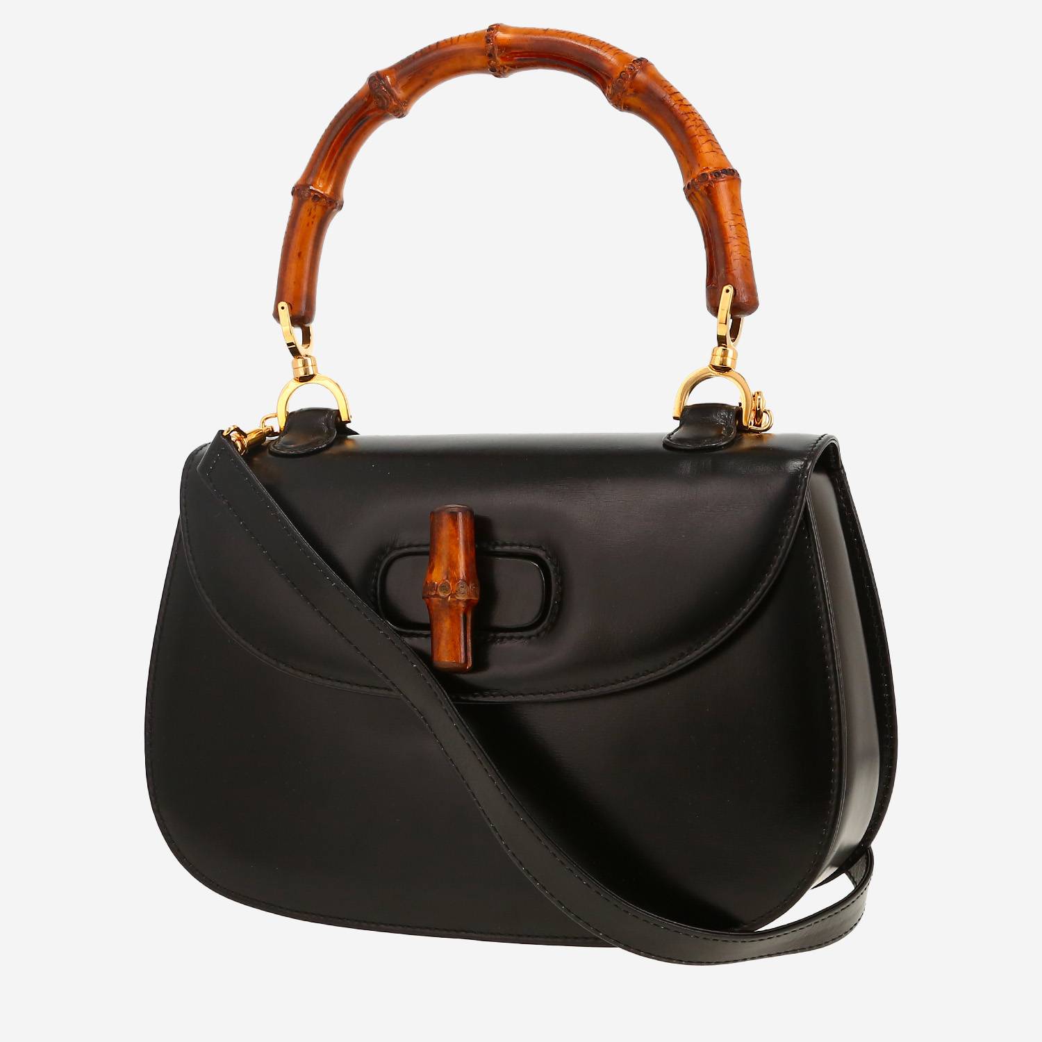 Magnifica borsa Gucci Bamboo in pelle nero e bambù, inserti in metallo dorato, manico in bambù, una tracolla rimovibile regolabile in pelle nera da portare a mano, in spalla o a tracolla.