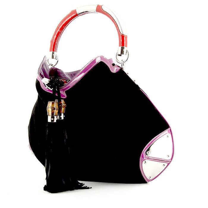 Incantevole borsa Gucci Indy Hobo in camoscio nero e pelle verniciata viola, inserti in metallo argentato, manico semplice in pelle rossa e metallo argentato da portare a mano o in spalla.