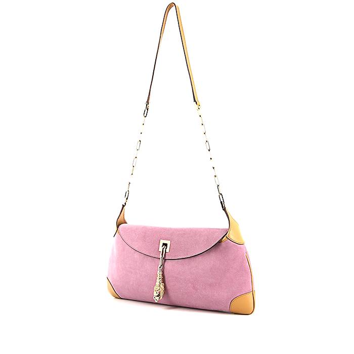 Raffinata borsa Gucci in camoscio rosa e pelle marrone, inserti in metallo dorato, una tracolla a catena da portare a mano o in spalla.
