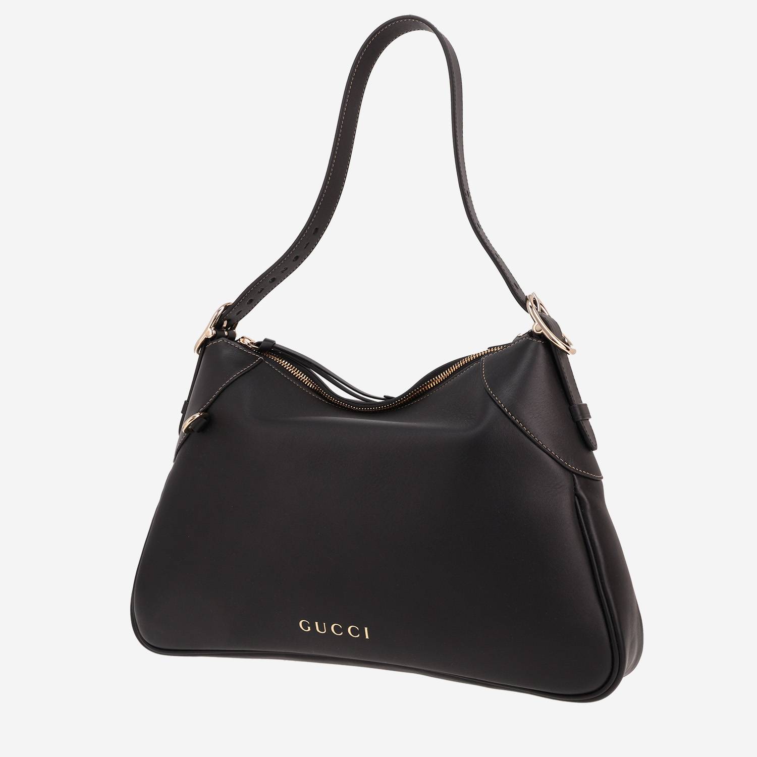 Magnifica borsa Gucci GG Emblem modello medio in pelle nero, inserti in metallo dorato, una tracolla regolabile in pelle nera da portare a mano o in spalla.