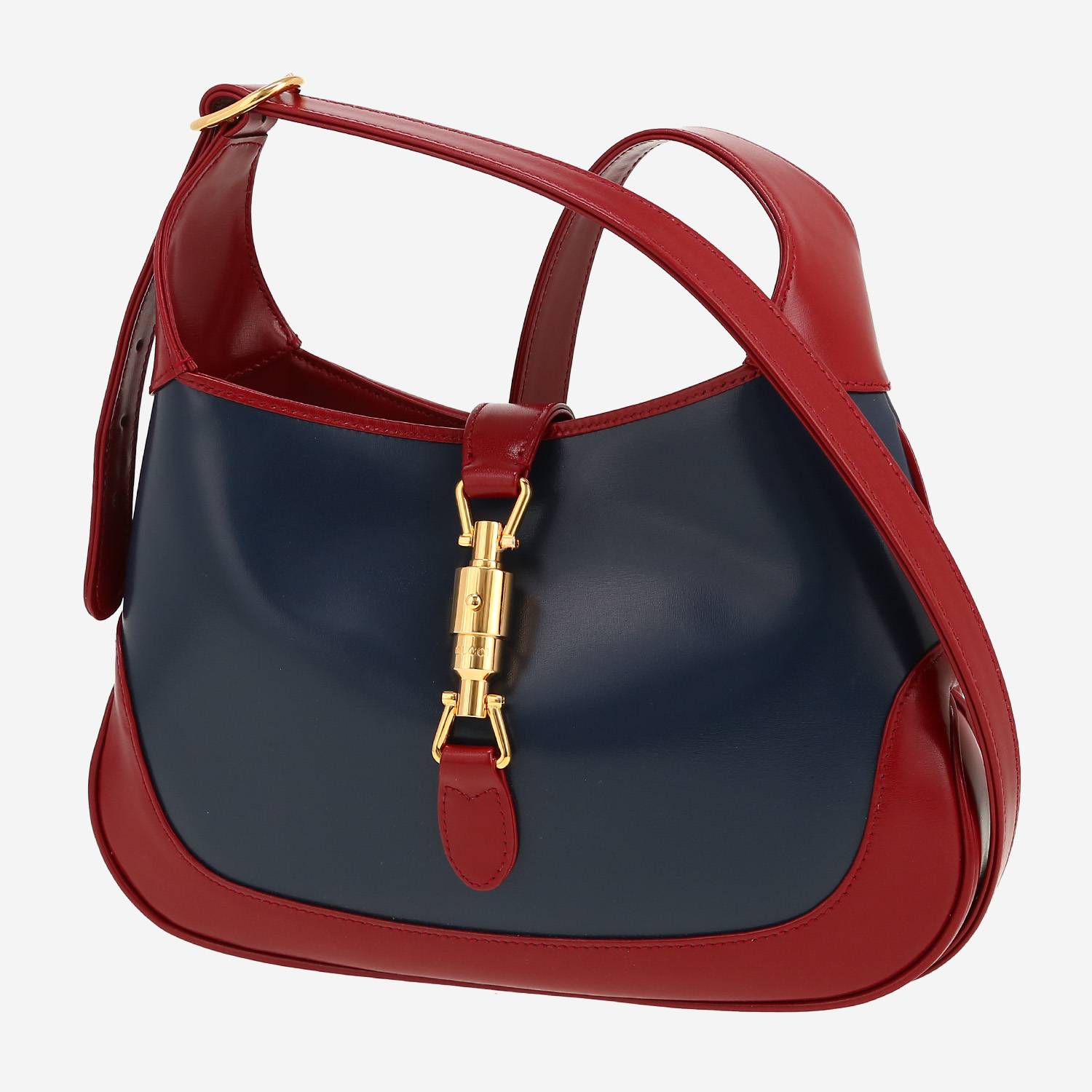 Magnifica borsa Gucci Jackie in pelle blu marino e rossa, inserti in metallo dorato, una tracolla trasformabile in pelle rossa da portare a mano, in spalla o a tracolla.