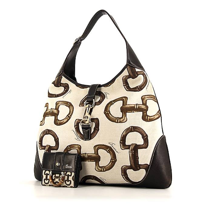 Borsa Gucci Jackie in tela color crema con motivo equestre e pelle marrone Ref Collector Square: 34 18 85