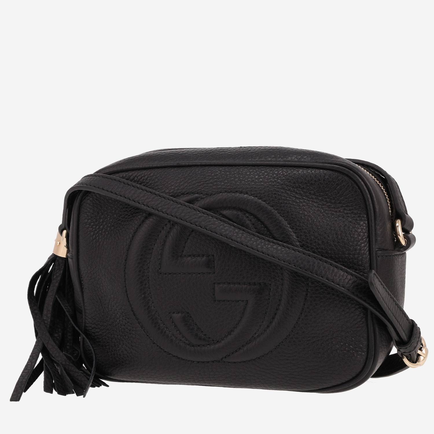 Magnifica borsa a tracolla Gucci Soho Disco in pelle martellata nero, inserti in metallo dorato, tracolla in pelle nera da portare in spalla o a tracolla.