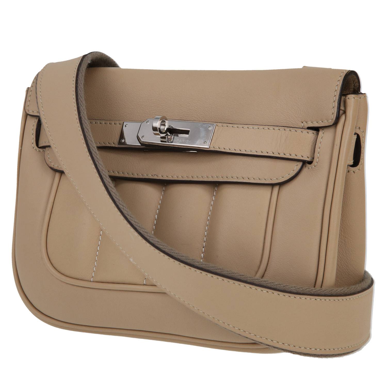 Borsa a tracolla Hermès Berline modello piccolo in pelle Swift beige, inserti in palladio, una tracolla removibile in tela e pelle bicolore da portare in spalla o a tracolla.