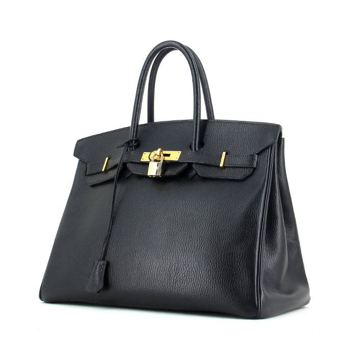 Inimitabile borsa "Birkin 35 cm" in pelle martellata nera, inserti in metallo dorato, doppio manico in pelle nera da portare a mano.