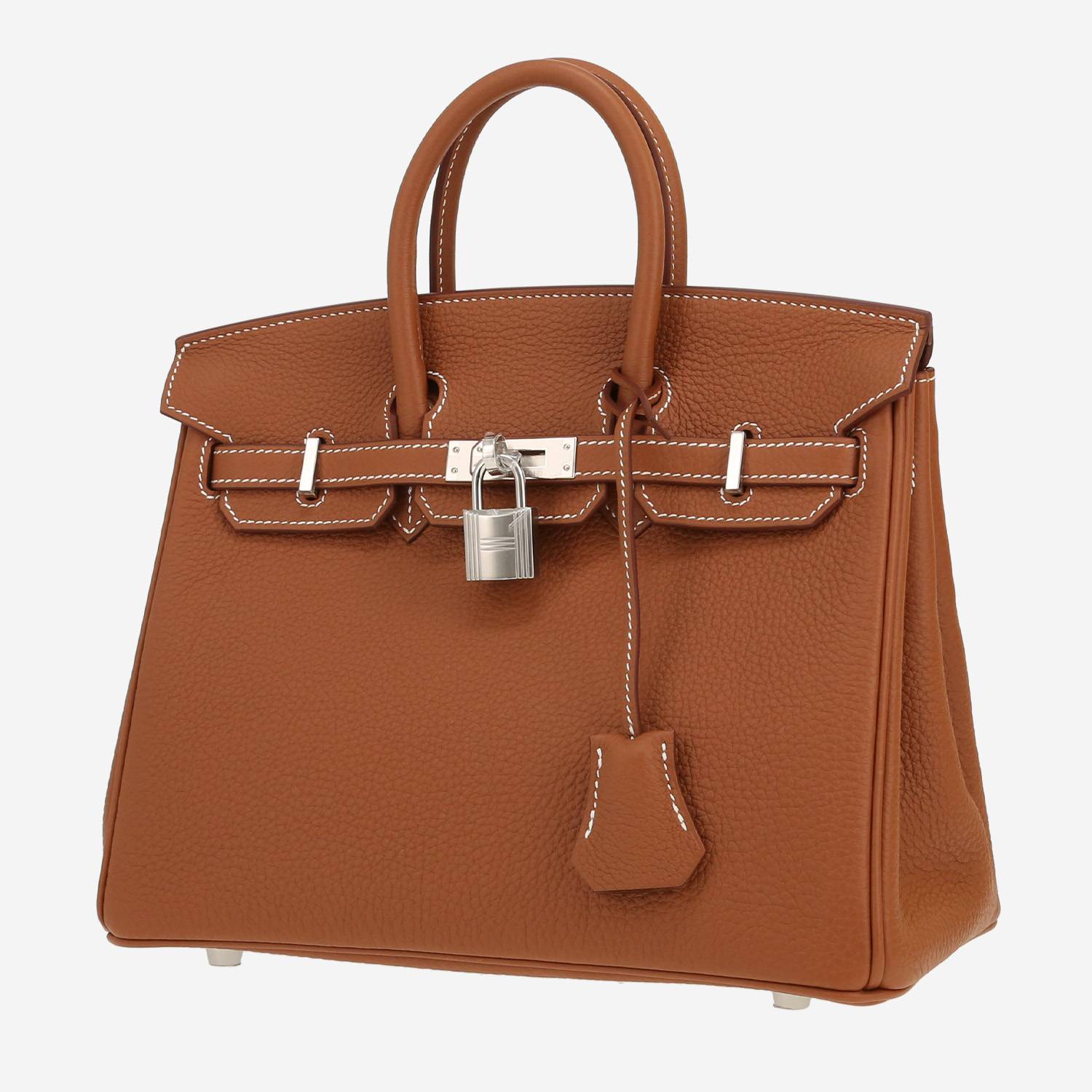 Inimitabile borsa Hermès Birkin 25 cm in pelle togo gold, inserti in palladio, doppio manico in pelle gold da portare a mano.