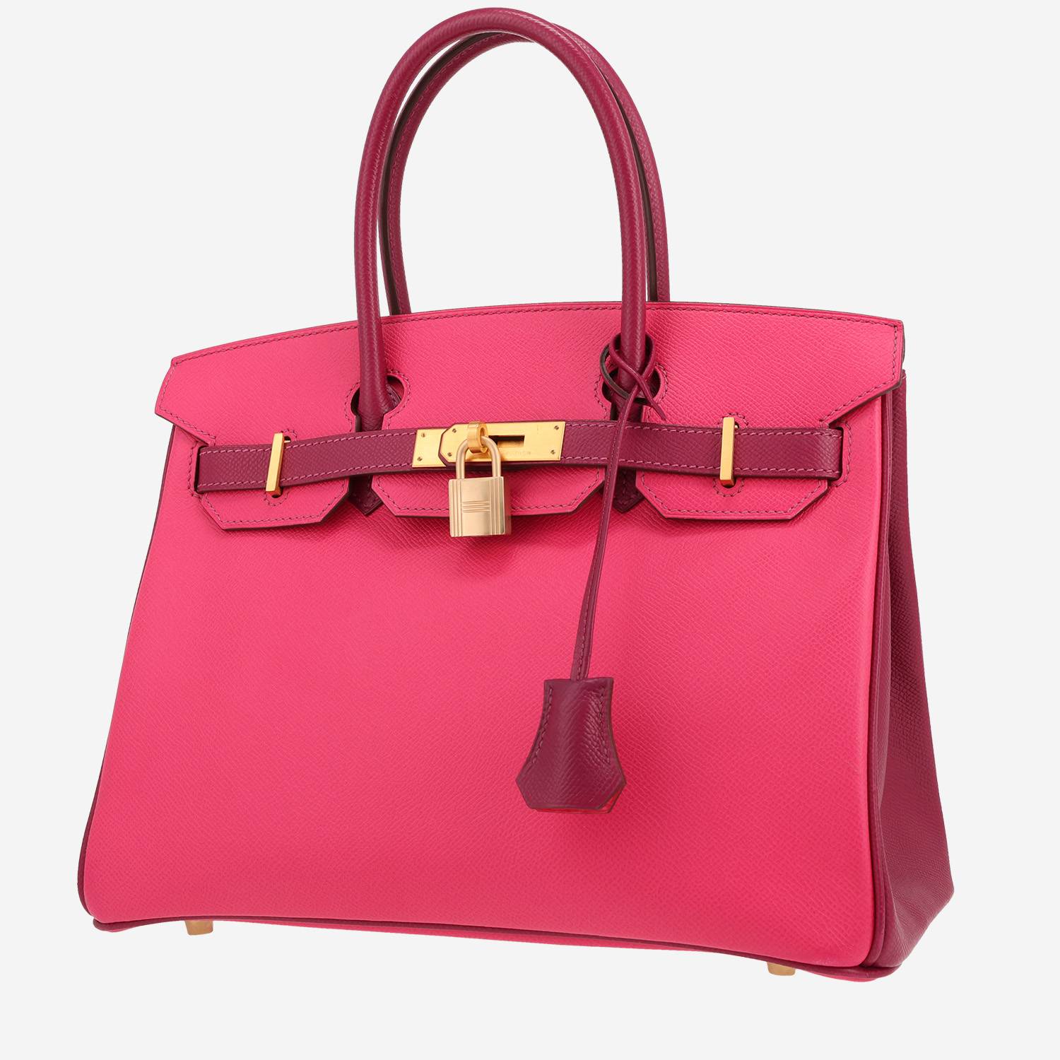 Magnifica borsa Hermès Birkin 30 cm in pelle Epsom Rose Shocking e rosa Tosca, inserti in metallo oro spazzolato, doppio manico in pelle rosa Tosca da portare a mano.