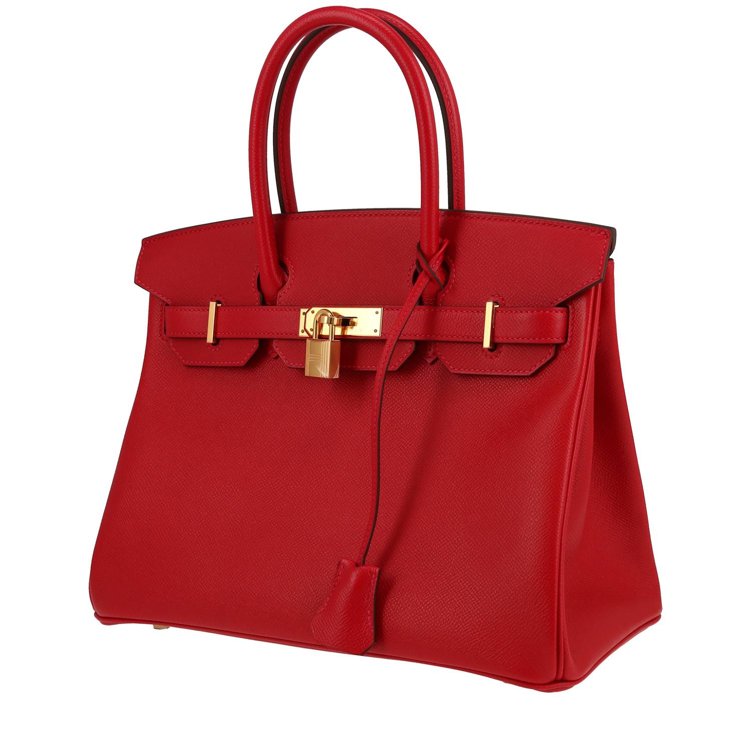 Elegante borsa Hermès Birkin 30 cm in pelle Epsom rosso Casaque, inserti in metallo dorato, doppio manico in pelle rosso Casaque da portare a mano.