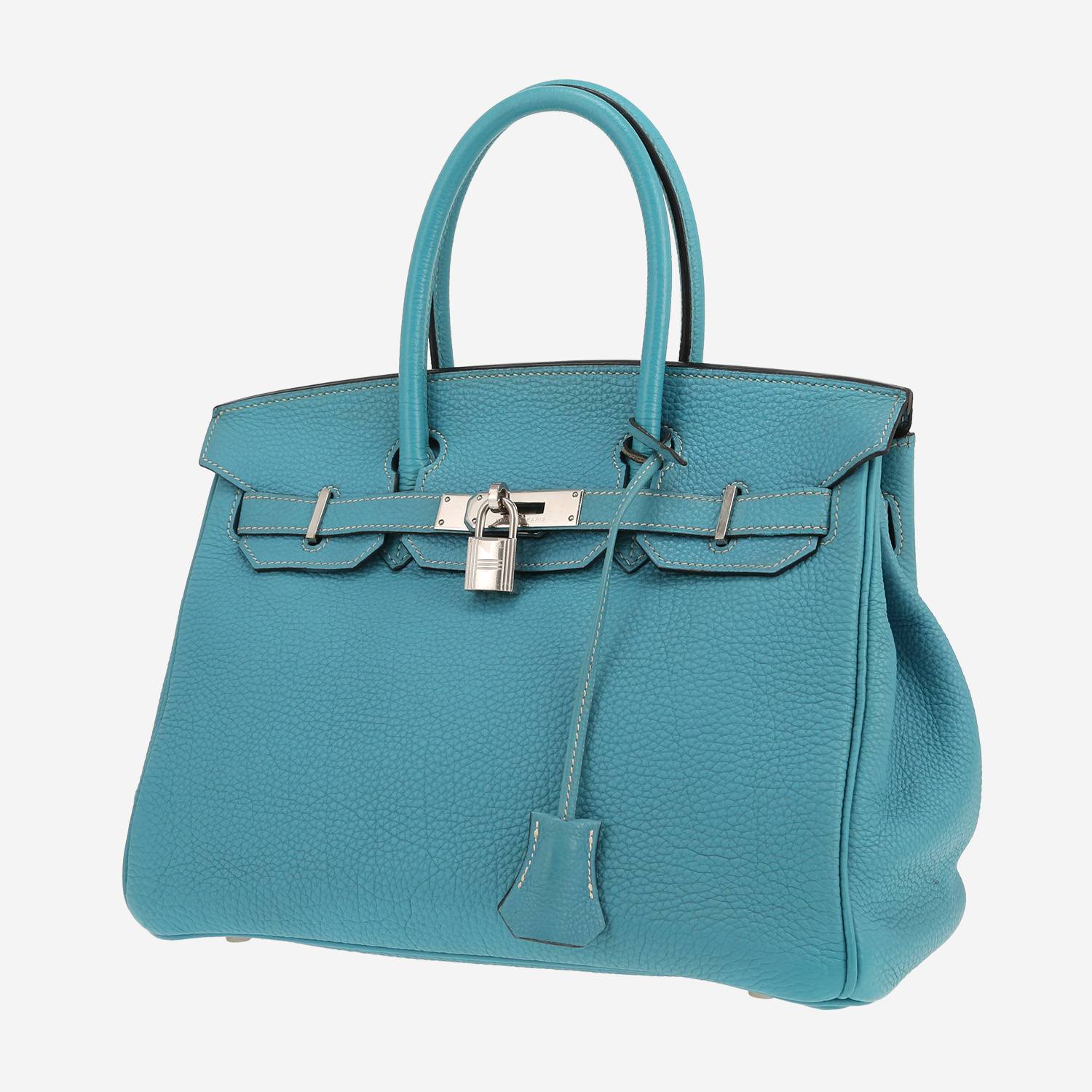Magnifica borsa Hermès Birkin 30 cm in pelle togo blu, inserti in palladio, doppio manico in pelle blu da portare a mano.