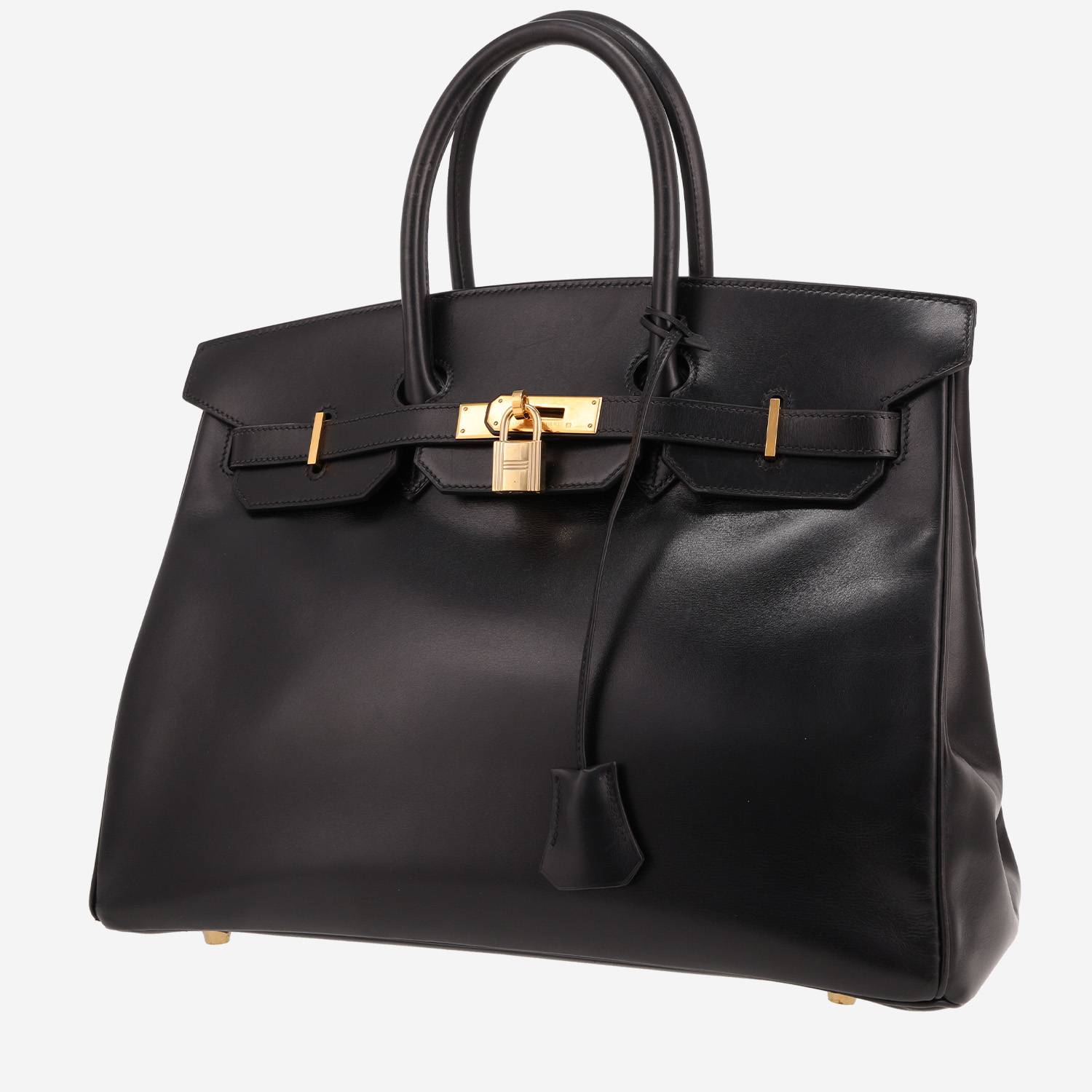 Inimitabile borsa Hermès Birkin 35 cm in pelle box nero, inserti in metallo dorato, doppio manico in pelle nera da portare a mano.
