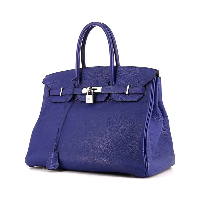 Intramontabile borsa Hermes Birkin 35 cm in pelle togo blu elettrico, inserti in palladio, doppio manico in pelle togo blu da portare a mano.