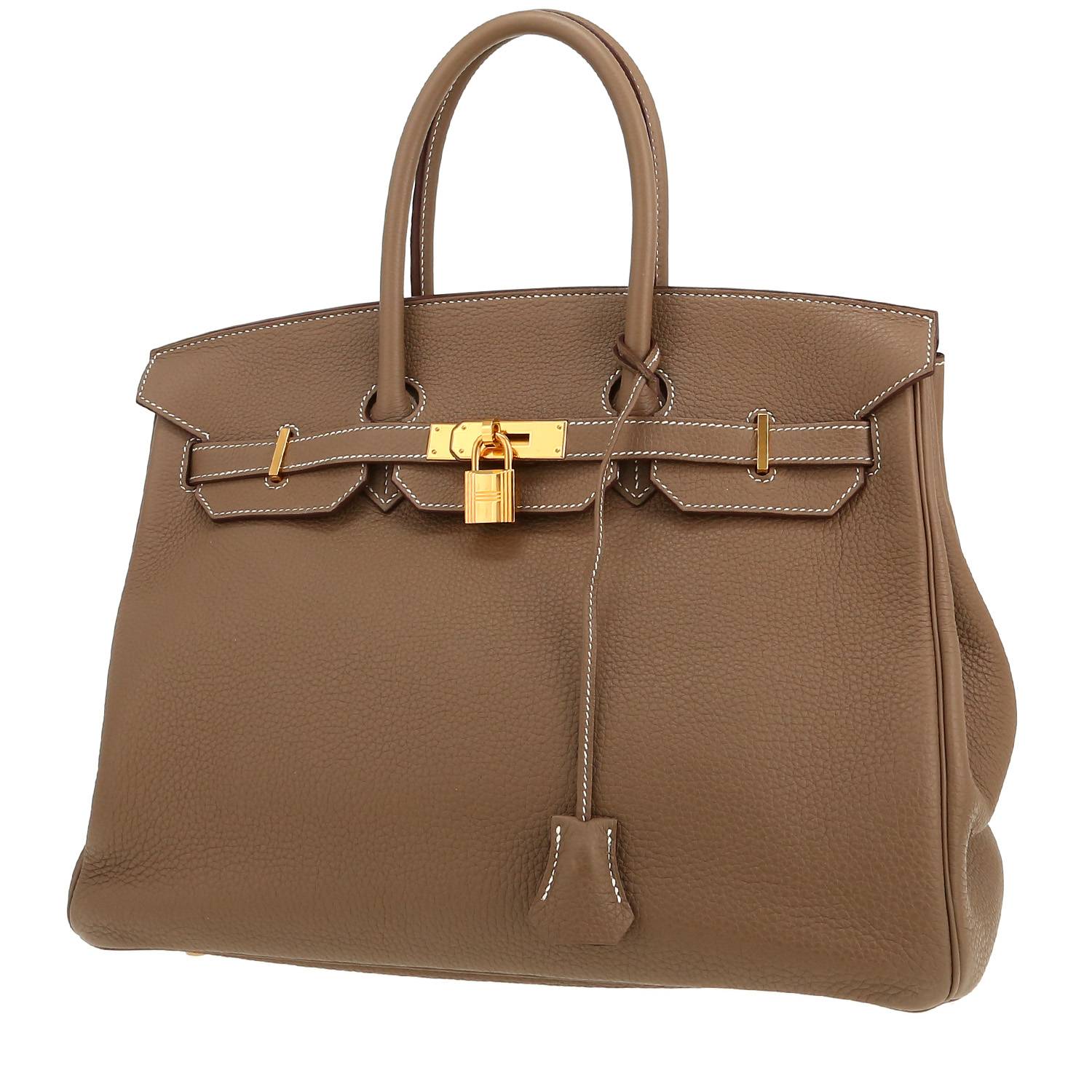 Straordinaria borsa Hermès Birkin 35 cm in pelle togo etoupe, inserti in metallo dorato, doppio manico in pelle etoupe da portare a mano.