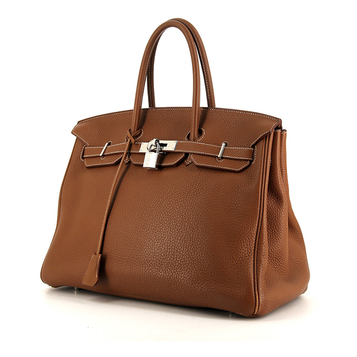 Elegante borsa Hermes Birkin 35 cm in pelle togo gold, inserti in palladio, doppio manico in pelle gold da portare a mano.