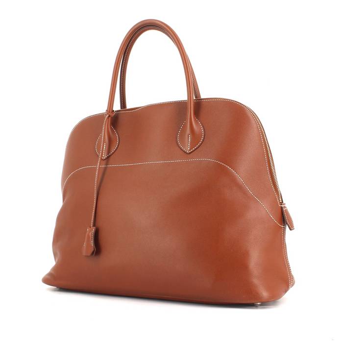 Bella borsa da viaggio "Bolide" in pelle taurillon sakkam marrone, cuciture a punto sella, doppio manico in pelle marrone da portare a mano.