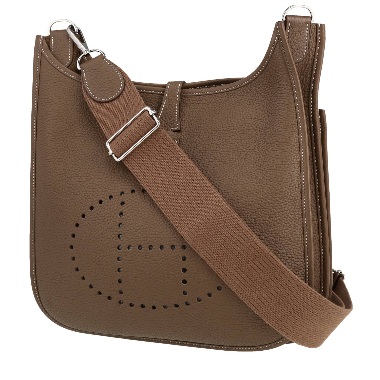 Elegante borsa a tracolla Hermès Evelyne in pelle togo etoupe, inserti in palladio, una tracolla removibile in tela etoupe da portare in spalla o a tracolla.
