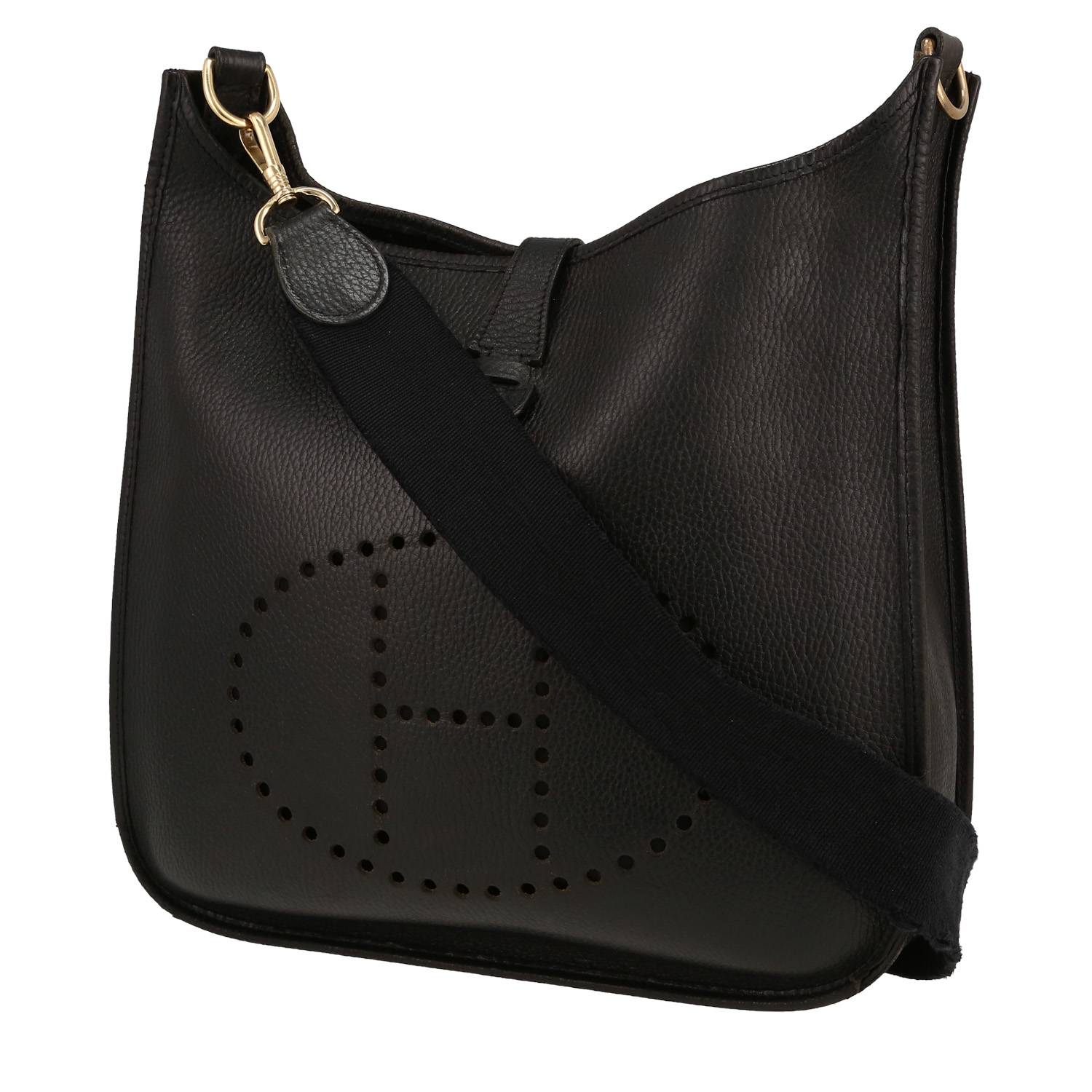 Pratica borsa a tracolla Hermès Evelyne in pelle togo nero, inserti in metallo dorato, una tracolla removibile in tela nera da portare in spalla o a tracolla.