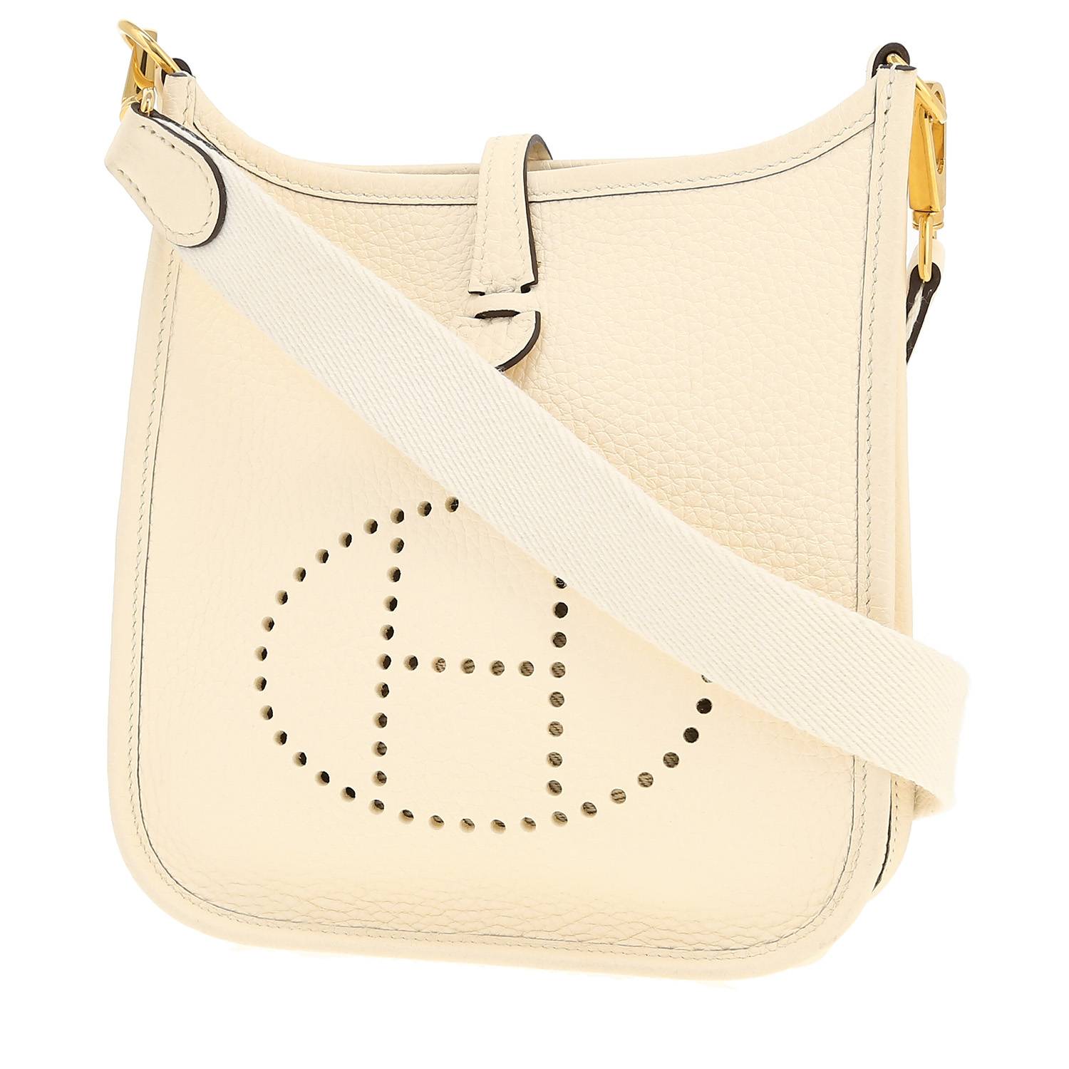 Magnifica borsa a tracolla Hermès Mini Evelyne in pelle taurillon clemence Nata, inserti in metallo dorato, tracolla removibile in tela Nata da portare in spalla o a tracolla.