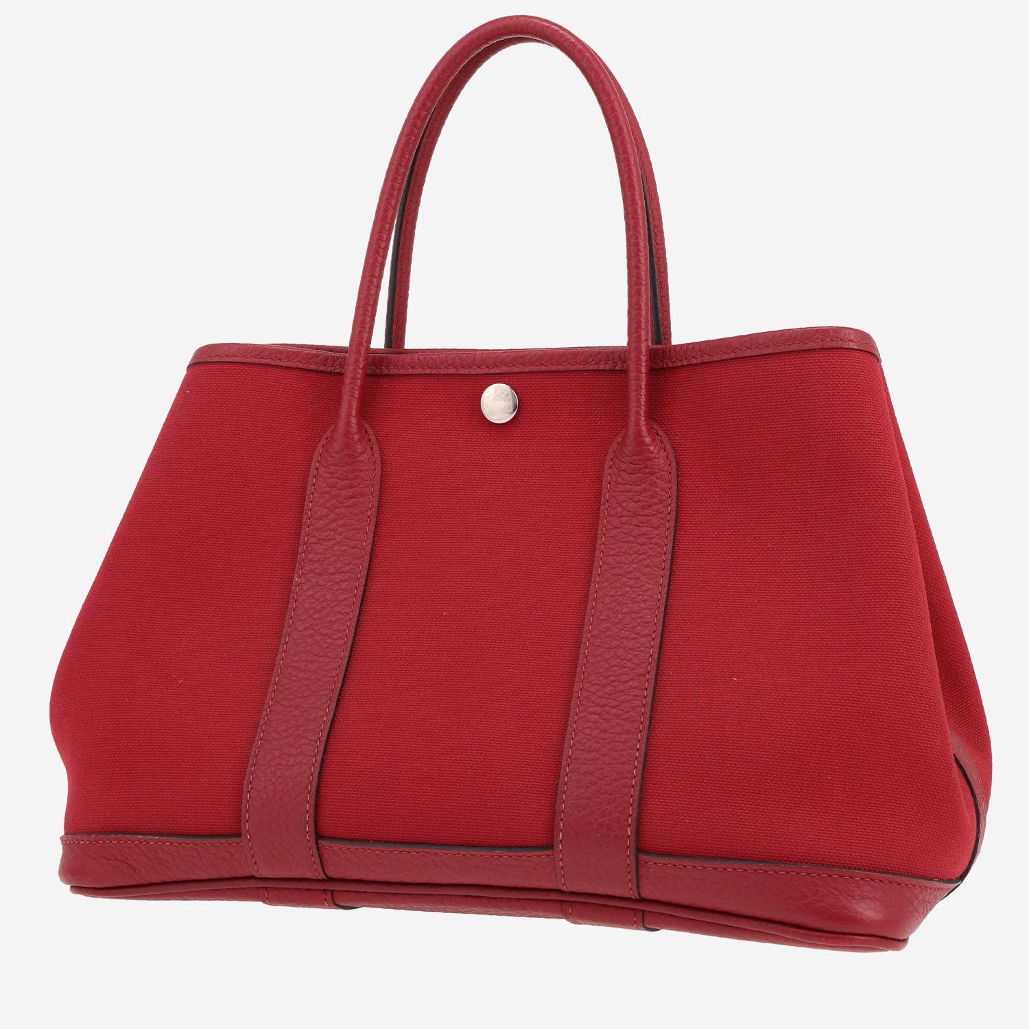 Elegante shopping bag Hermès Garden Party 30 cm in tela rosso H e pelle rosso granata, inserti in metallo argentato, doppio manico in pelle rosso granata da portare a mano.