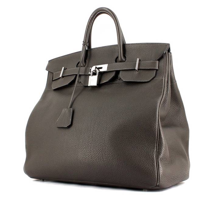 Straordinaria borsa weekend "Haut à Courroies" in pelle togo grigia, inserti in palladio, impunture bianche, doppio manico in pelle grigia da portare a mano.