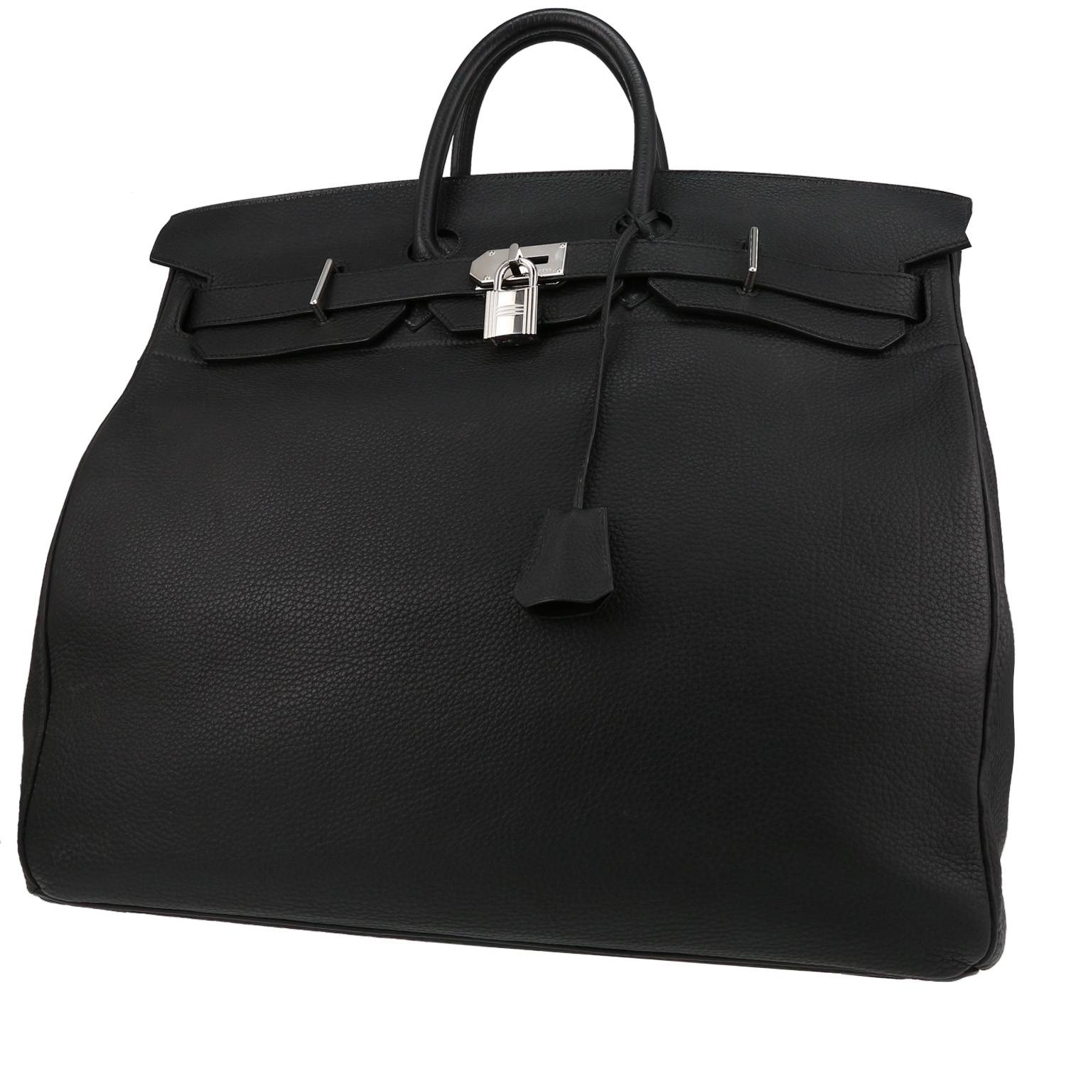 Pratica borsa weekend Hermès Haut à Courroies in pelle togo nero, inserti in palladio, doppio manico in pelle nera da portare a mano.