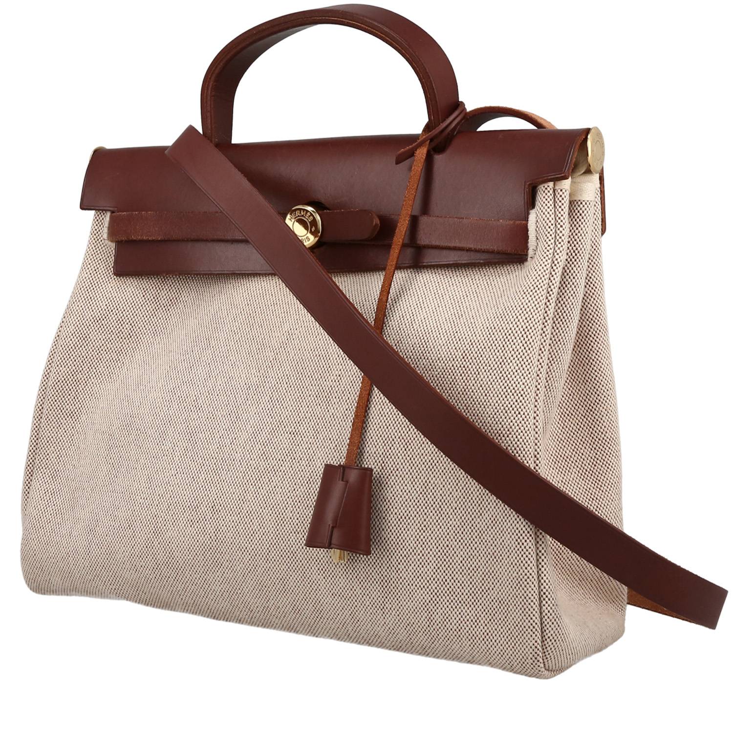 Inimitabile borsa a tracolla Hermès Herbag in tela beige e mucca Hunter marrone, inserti in metallo dorato, manico in mucca Hunter marrone, una tracolla in mucca Hunter marrone da portare a mano, in spalla o a tracolla.