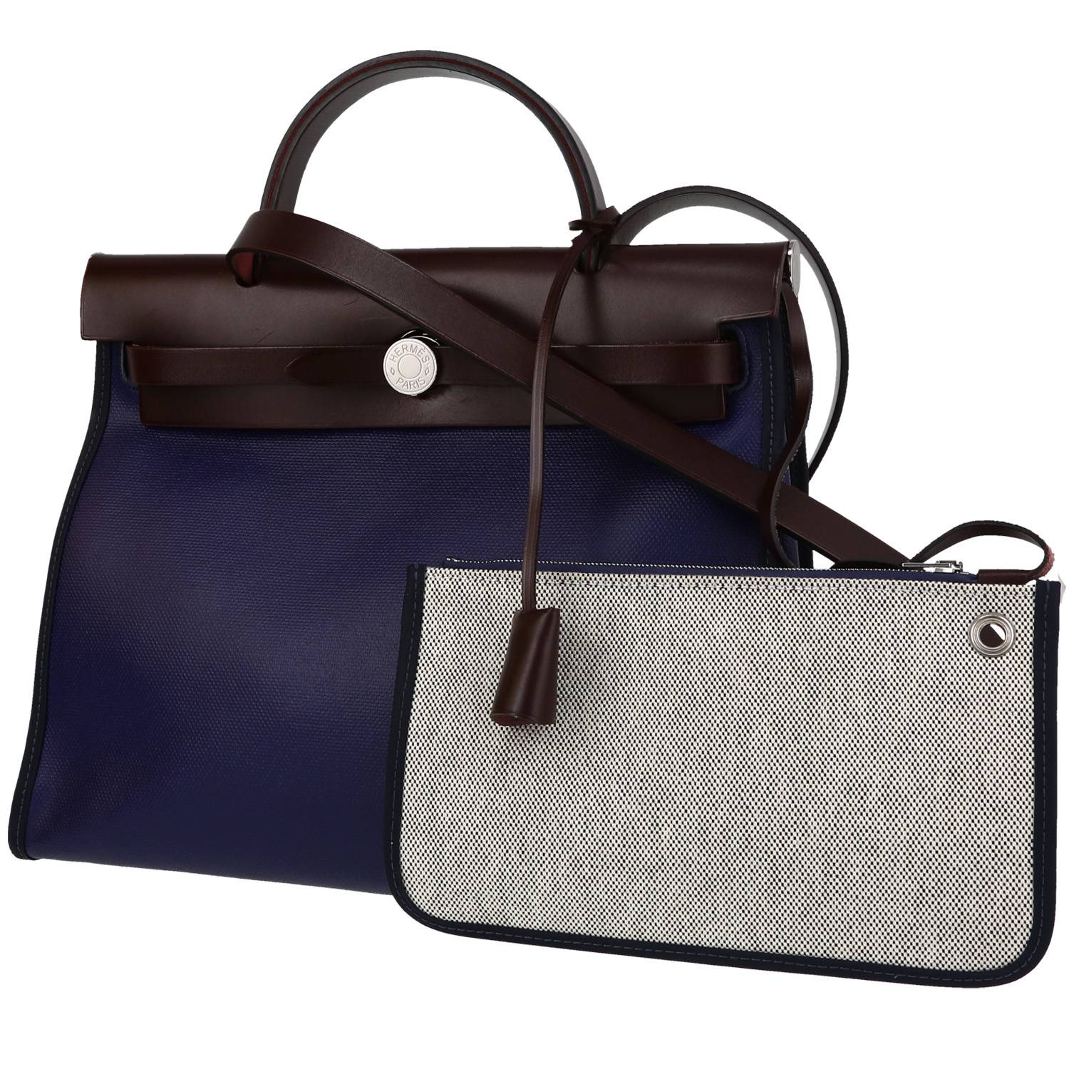 Borsa da spalla o a mano Hermès Herbag in tela cerata Bleu Encre e pelle Rouge Sellier Ref Collector Square: 40 34 98