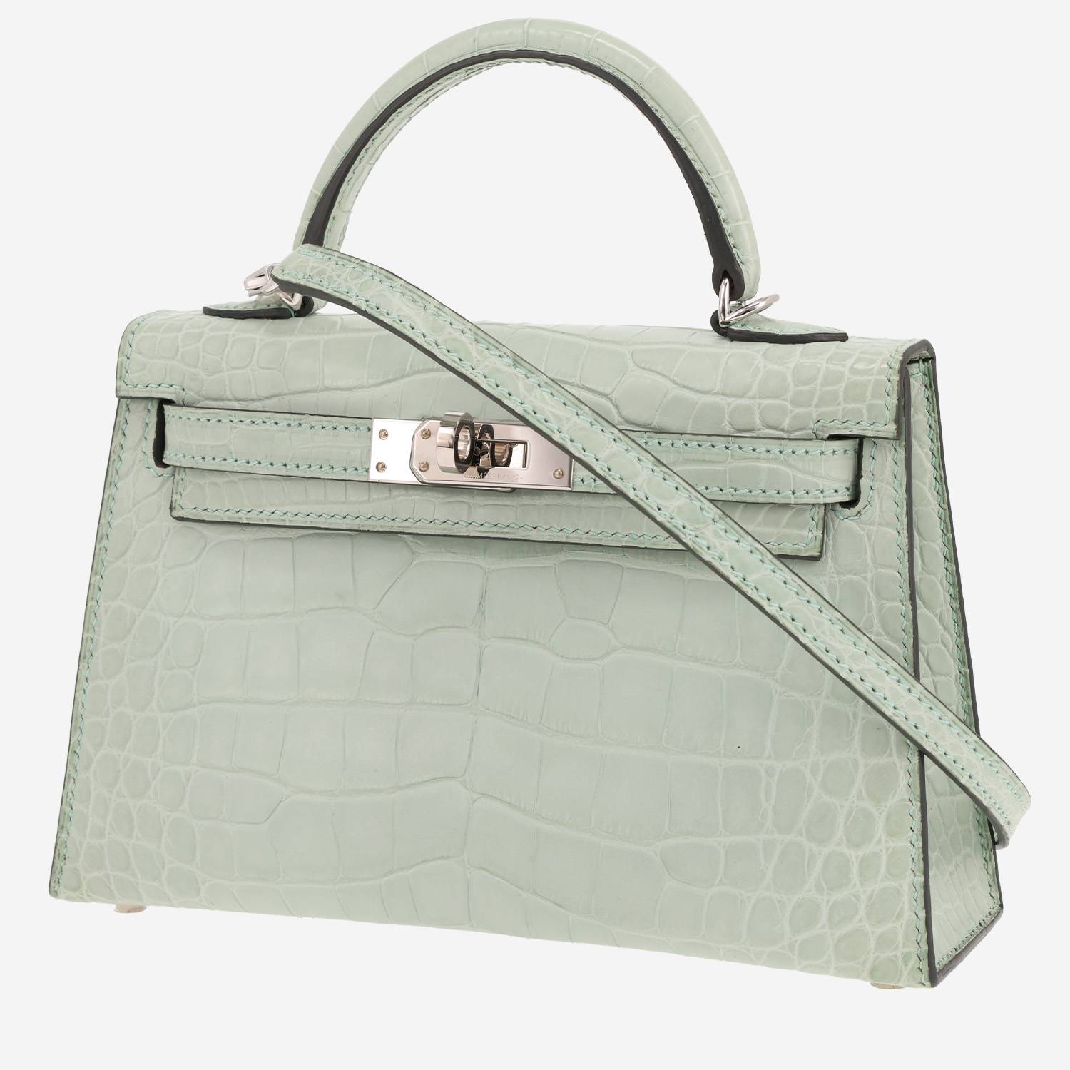 Elegante borsa a tracolla Hermès Kelly 20 cm in alligatore verde acqua, inserti in palladio, manico in alligatore verde acqua, una tracolla removibile in alligatore verde acqua da portare a mano, in spalla o a tracolla.