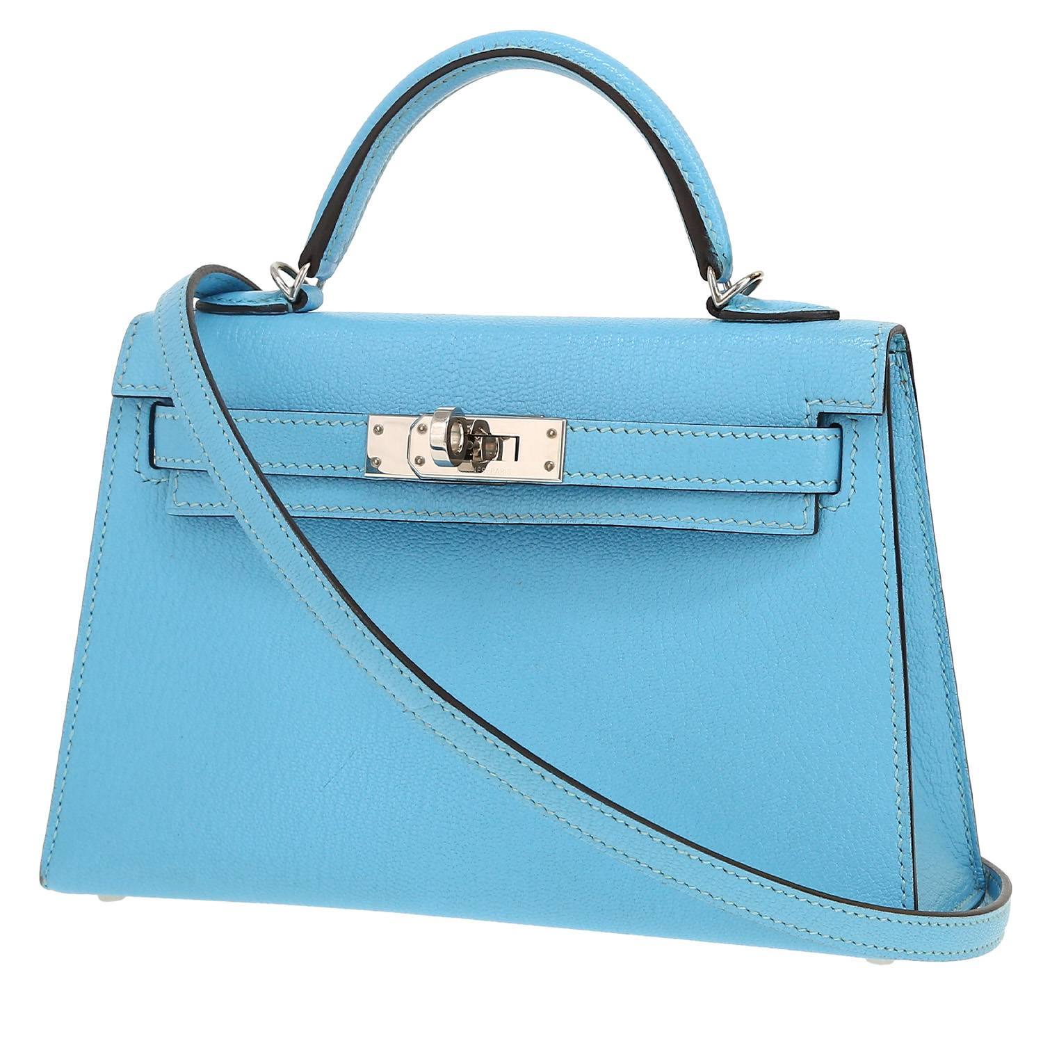 Magnifica borsa a tracolla Hermès Kelly 20 cm in pelle Mysore blu Celeste, inserti in palladio, manico in pelle blu, una tracolla removibile in pelle blu da portare a mano, in spalla o a tracolla.